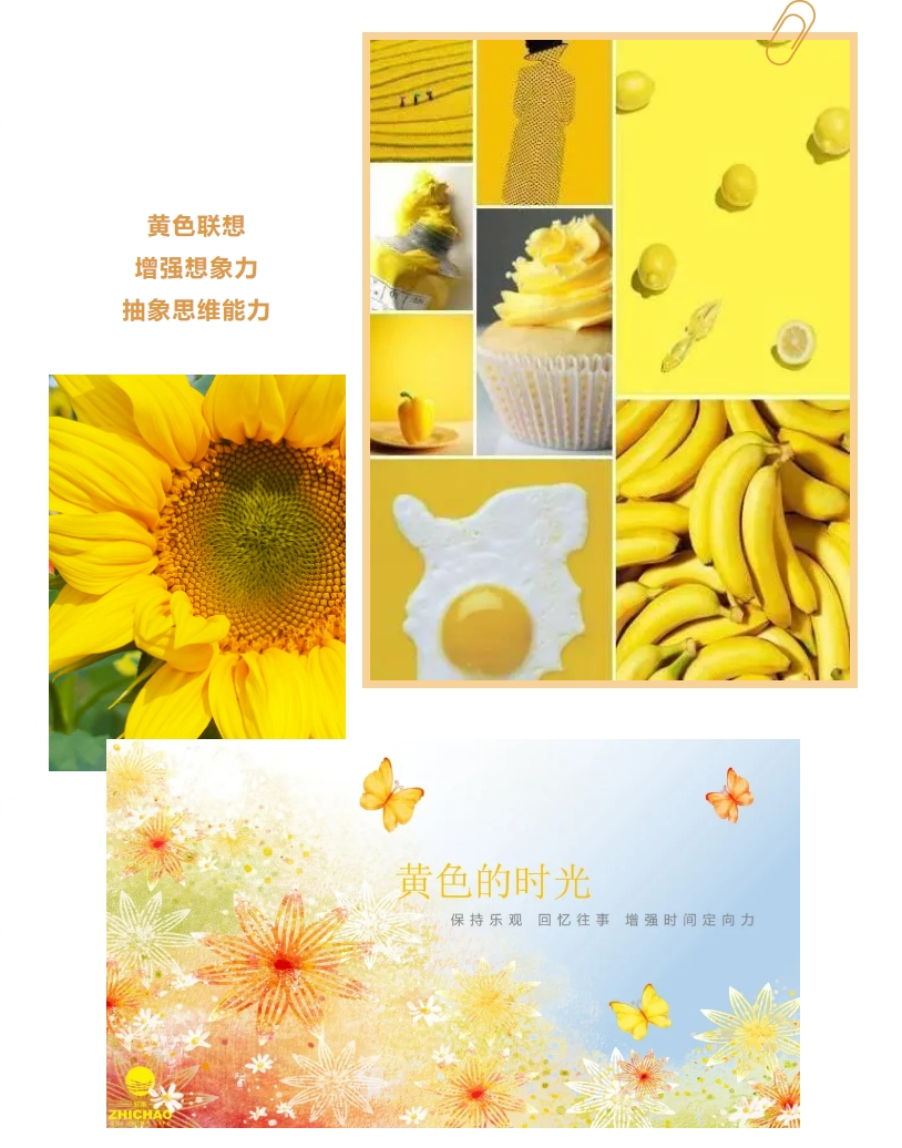 不(bù)同的(de)顔色可(kě)以聯想到(dào)不(bù)同的(de)物(wù)體(tǐ),黃(huáng)色的 (de)實物(wù)聯想可(kě)以想到(dào)小(xiǎo)雞、檸檬片、香蕉等。抽象聯想會(huì)想到(dào)光λ(guāng)明(míng)、希望。