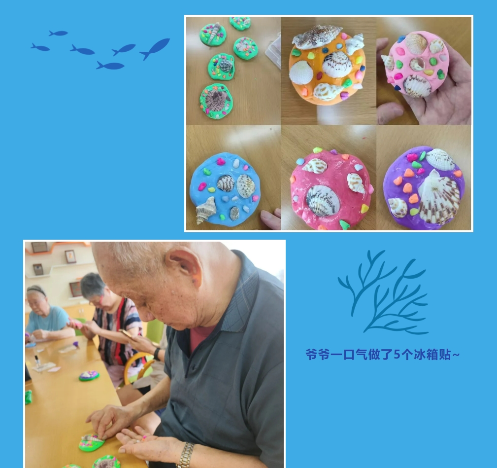 本次深藍(lán)色海(hǎi)洋主題的(de)手工(gōng)制(zhì)作(zuò)是(shì)黏土(tǔ)冰箱貼。爺爺奶奶們先要(yào)選取喜歡的(de)顔色黏土(tǔ÷)通(tōng)過揉搓,可(kě)以塑造自(zì)己喜歡的(de)形狀,在挑選不(bù)同造型的(de)貝殼裝飾物(w¶ù)和(hé)彩色小(xiǎo)石子(zǐ)進行(xíng)裝飾,獨一(yī)無二的(de)海(hǎi)洋冰箱貼就(j↔iù)制(zhì)作(zuò)完成啦!